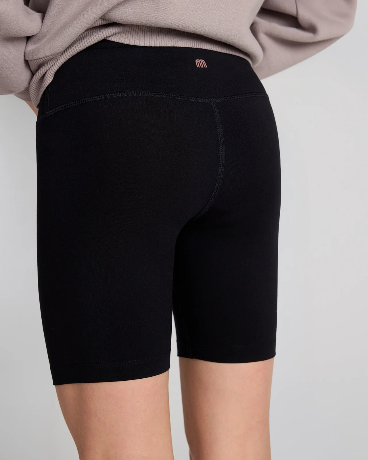 Fitted bike shorts in recycled peached interlock made with 84% recycled polyester. Yoga waistband, flatlock seams, and an internal infinity drawcord with fuzzy elastic for comfort and fit. Perfect for play, movement, and active days outside.