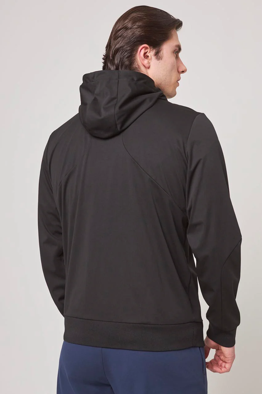 Lightweight full-zip hoody in interlock bonded fabric made with 70% recycled polyester. Seam-sealed chest zip pocket, two zippered side pockets, ribbed cuffs and hem, serged seams throughout, and an adjustable cinch-cord hood. Offers reliable protection from wind and light rain during active commutes, travel, and transitional weather.