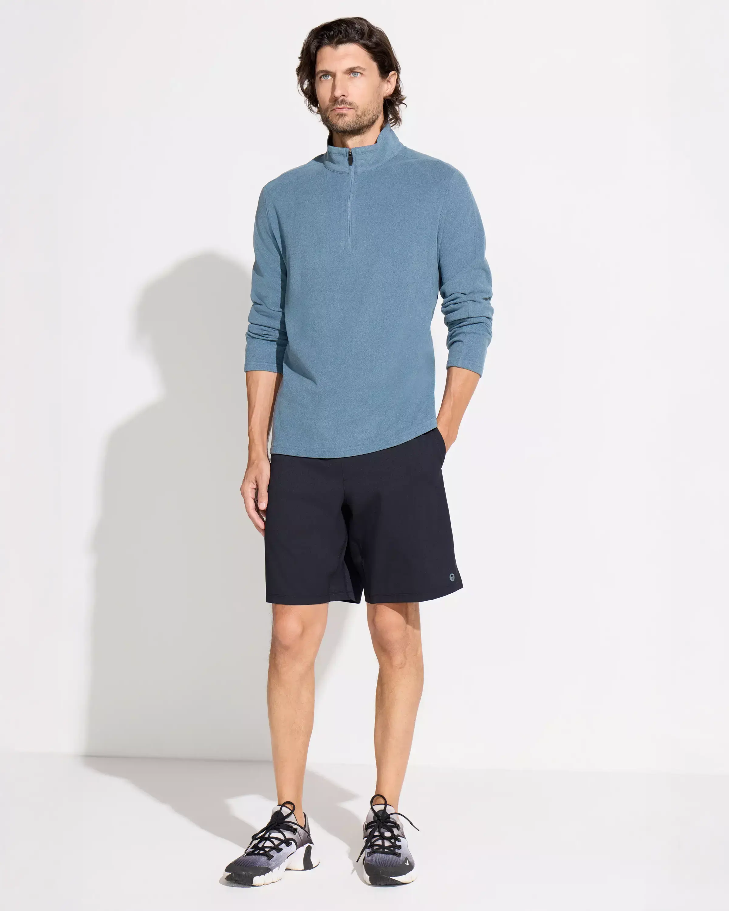 Quarter-zip pullover in recycled velour fleece with 55% recycled polyester. Shaped hem, set-in front and raglan back armholes, and an 8.25" front zip for versatile coverage. Essential for transitional temps, chilly commutes, or relaxed recovery days.
