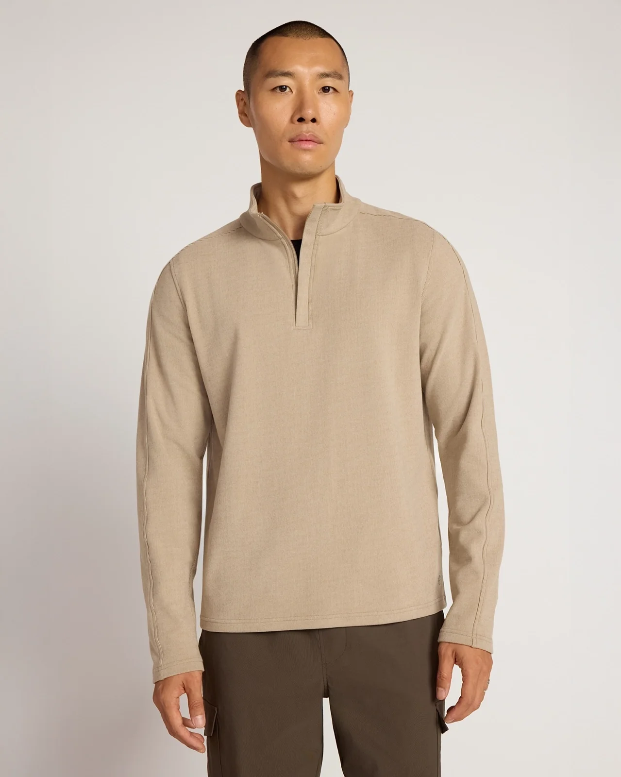 Half-zip pullover in cozy velour made with 51% recycled polyester. Shaped hem, placket at center front, and a mix of set-in front and raglan back armhole construction. Offers warmth, stretch, and an elevated look for on-the-go comfort and transitional layering.