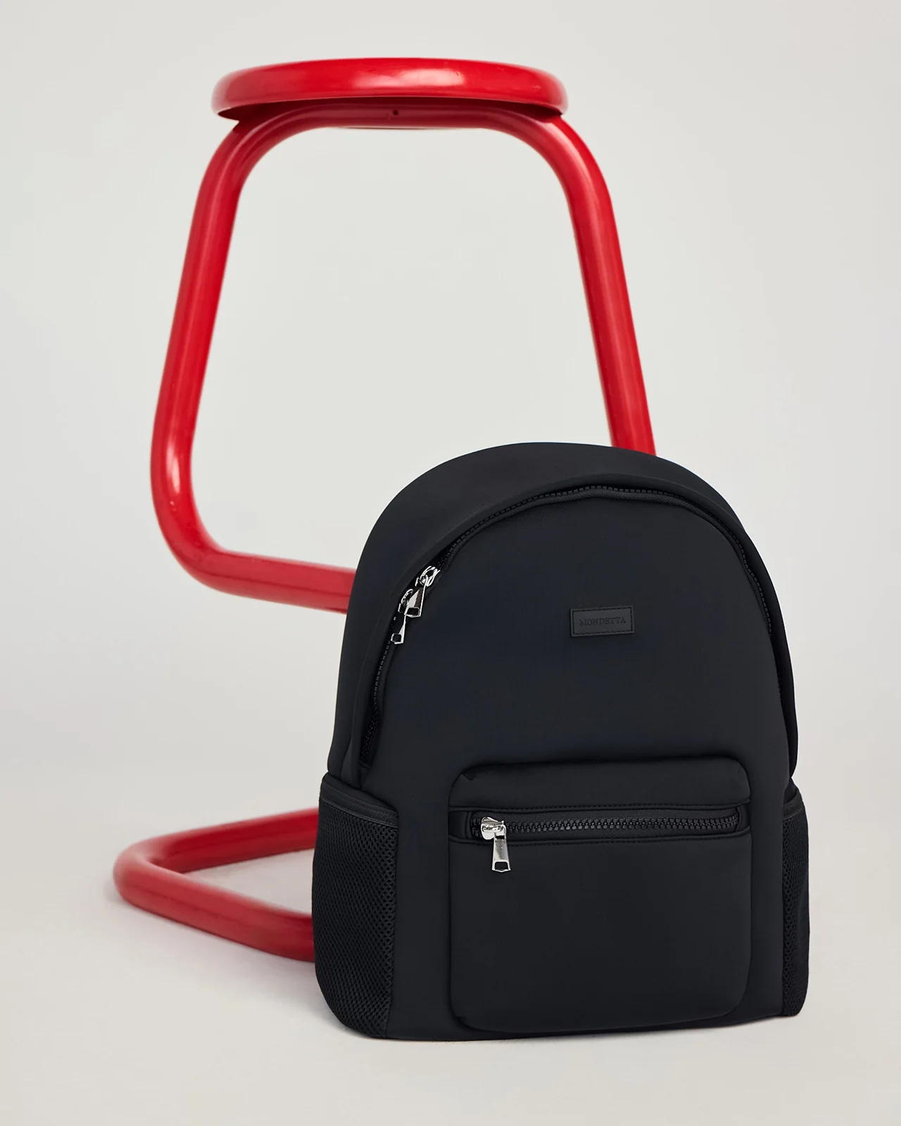Structured backpack crafted from 1.5mm double-sided composite neoprene with 85% SBR and 15% CR rubber, bonded to a nylon-spandex face and lined with recycled polyester. Padded back and straps, metal trims, embossed branding, zippered compartments, side slip pockets, and an internal phone sleeve. A sleek, functional companion for city errands, light travel, or daily commutes.