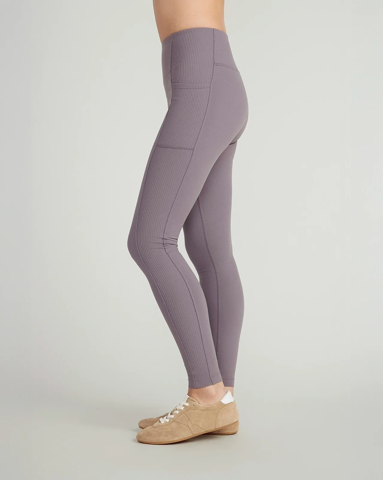 A high-waisted performance legging made with 75% recycled nylon. A fitted silhouette, tonal side panels in rib knit, and streamlined side pockets. Unparalleled comfort for high-movement workouts, weekend plans, and multi-purpose activities.