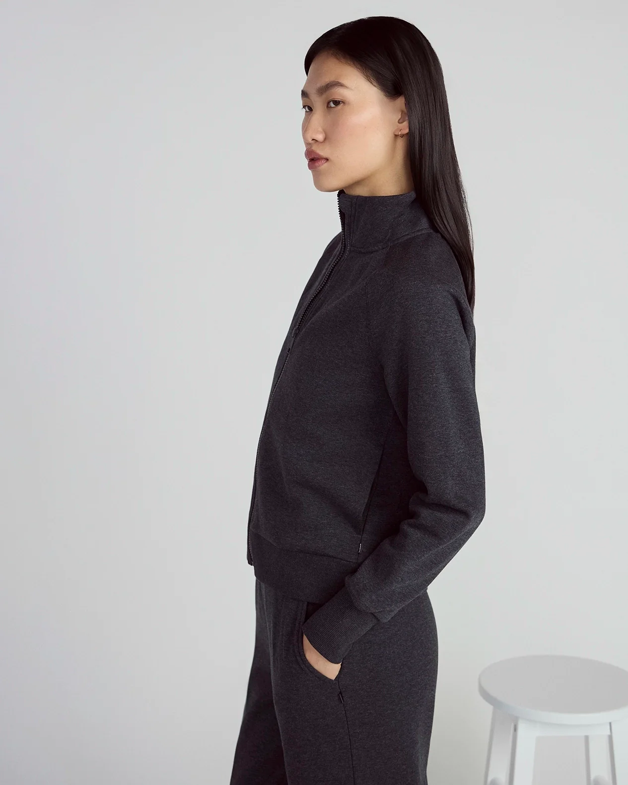 A full-zip jacket in soft mélange fleece made with 74% recycled polyester and 23% organic cotton. Raglan sleeves, side pockets, soft fleece interior, and matching rib trims for cozy versatility. Built for cold-weather commutes, weekend errands, or outdoor training.