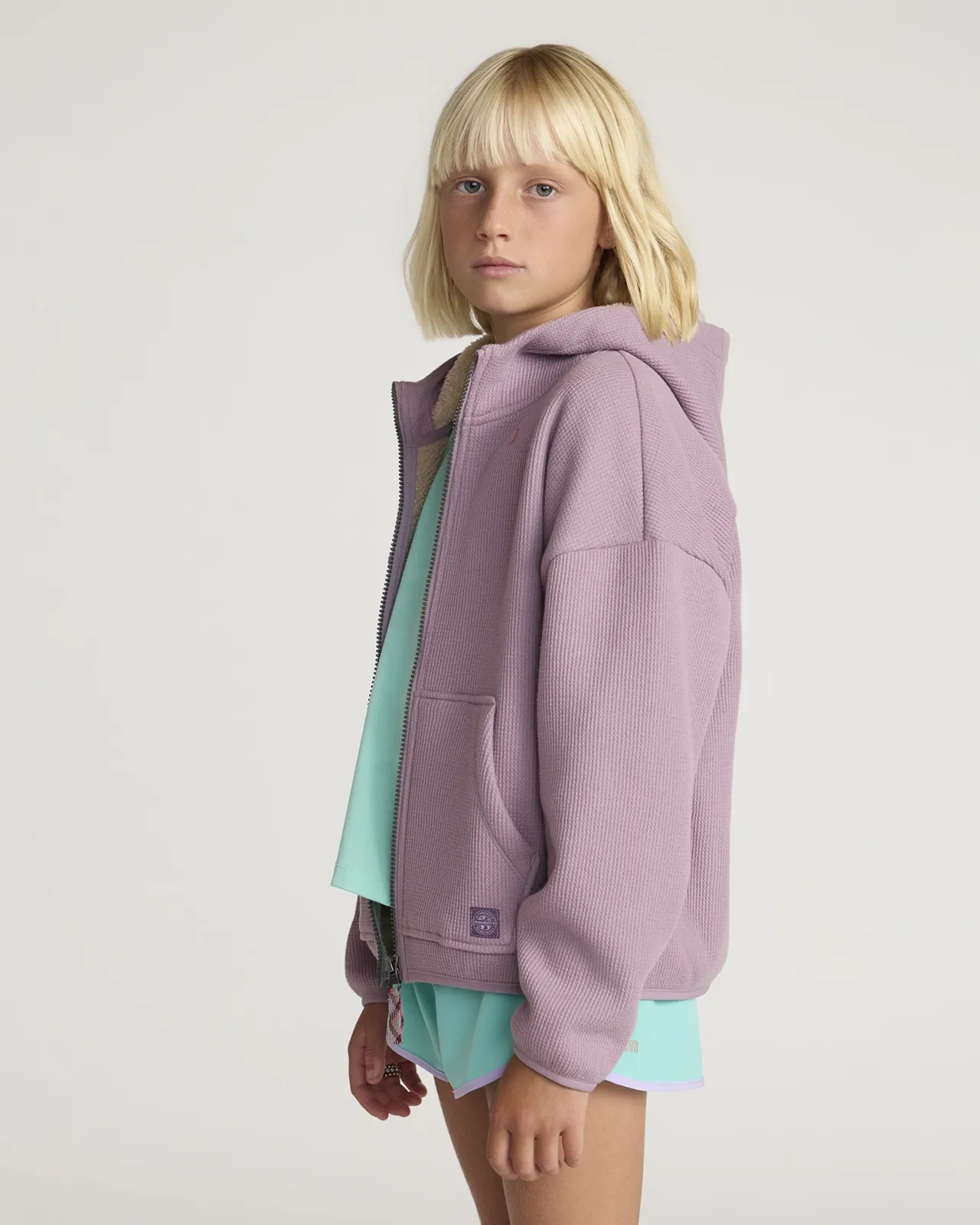 Cozy full-zip jacket in waffle-textured fabric bonded to soft Berber fleece made with a face of 60% organic cotton, and a back of 100% recycled polyester. Attached hood, kangaroo pocket, contrast zip puller, and tonal patch branding. A warm, laid-back layer that’s ready for classroom mornings, outdoor play, or weekend activities.
